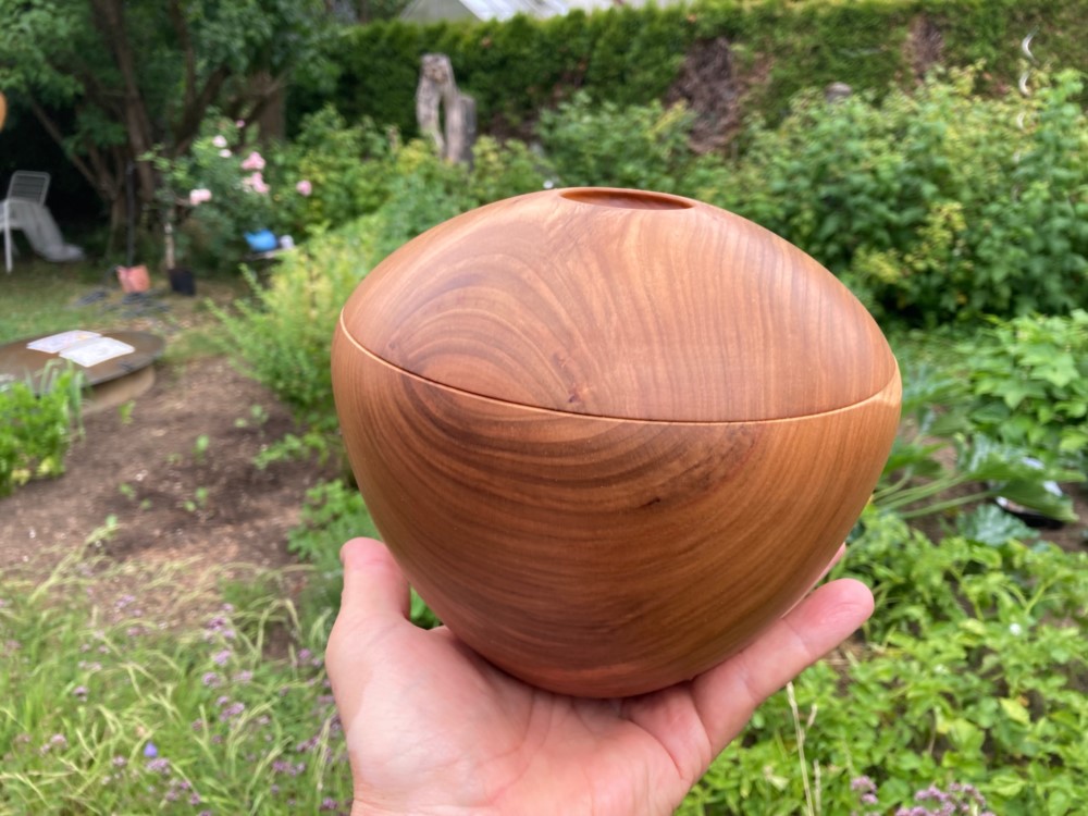 Dieser vorgedrechselte Rohling geht auf Trockungs-"Zeitreise" und wird erst nach kompletter Trocknung (mehrere Monate) fertig gedrechselt.