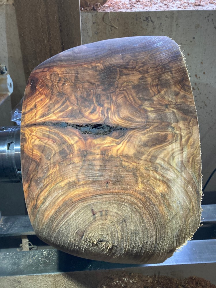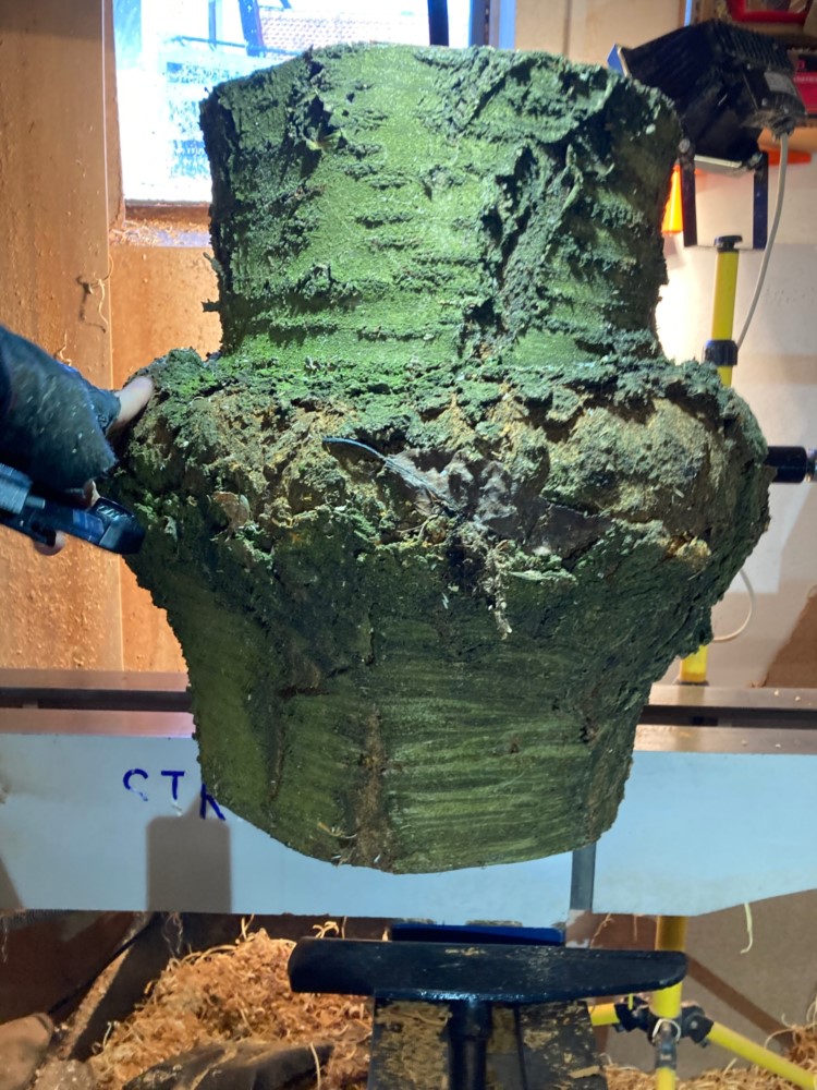 Nach der Trocknung wird der jetzt verzogene Rohling in die Maschine eingespannt und wieder rund gedreht. Das Holz ist nun sehr hart im Vergleich zum grünen Holz.