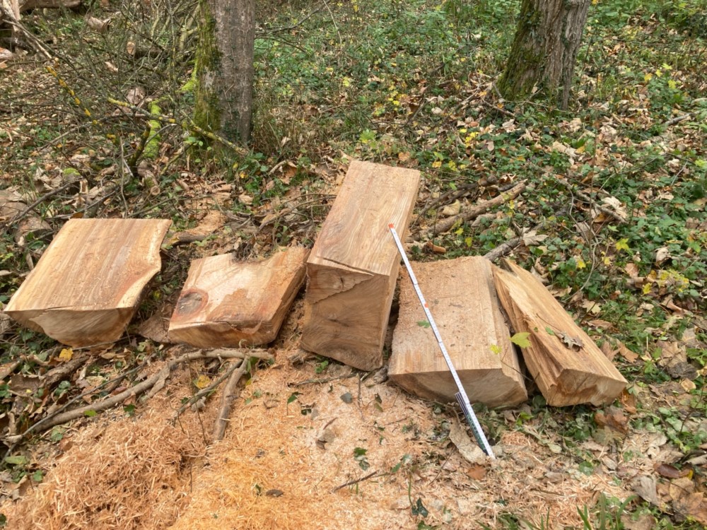 In einem ersten langwierigen Arbeitsgang wird der Stamm und interessante dickere Äste vor Ort zugeschnitten...