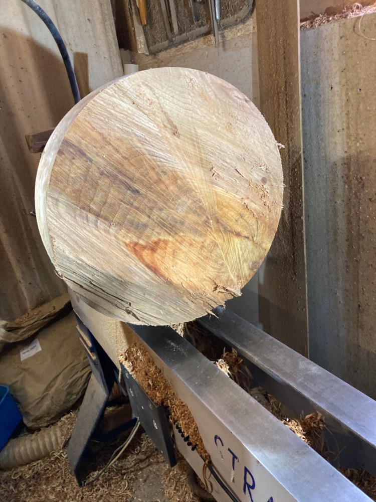 Ich entscheide von Stück zu Stück, wie ich den Block zuschneide. Meist wird er mit der Kettensäge schon komplett halbrund vorbereitet für das Einspannen in die Drehmaschine.